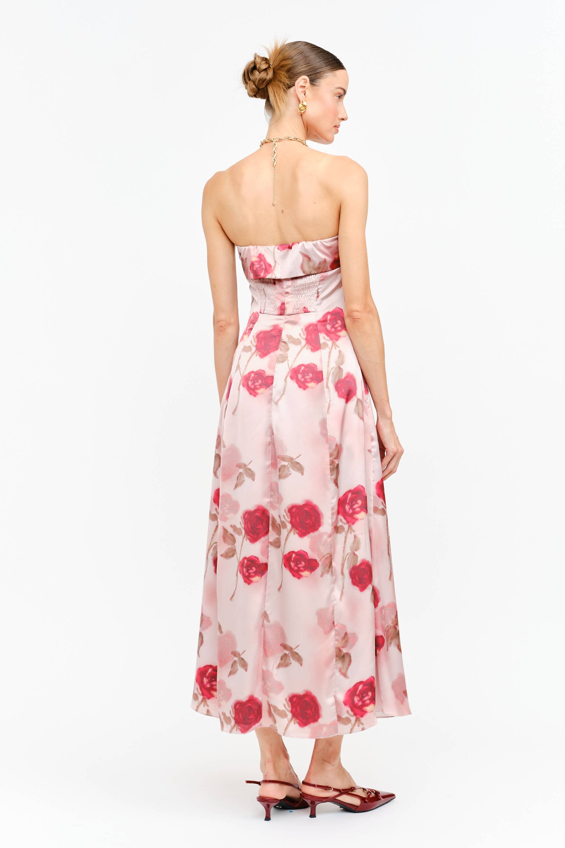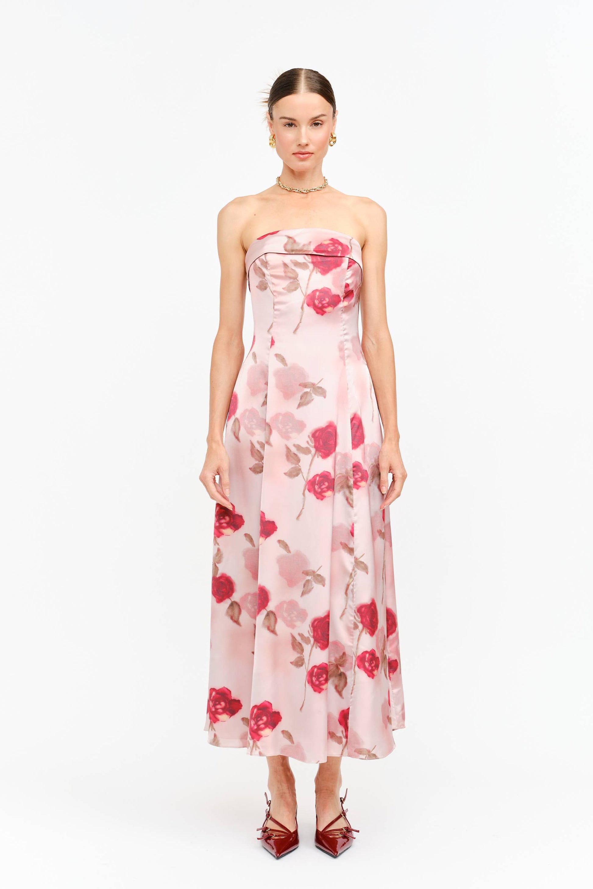 Rosie Dress Soft and sculptural, this strapless midi dress pairs timeless romance with a clean, modern silhouette. Featuring a structured bodice and soft pleats throughout the skirt, it’s finished in a dreamy floral print with delicate watercolor roses. The smocked back panel offers added comfort and a flattering fit.