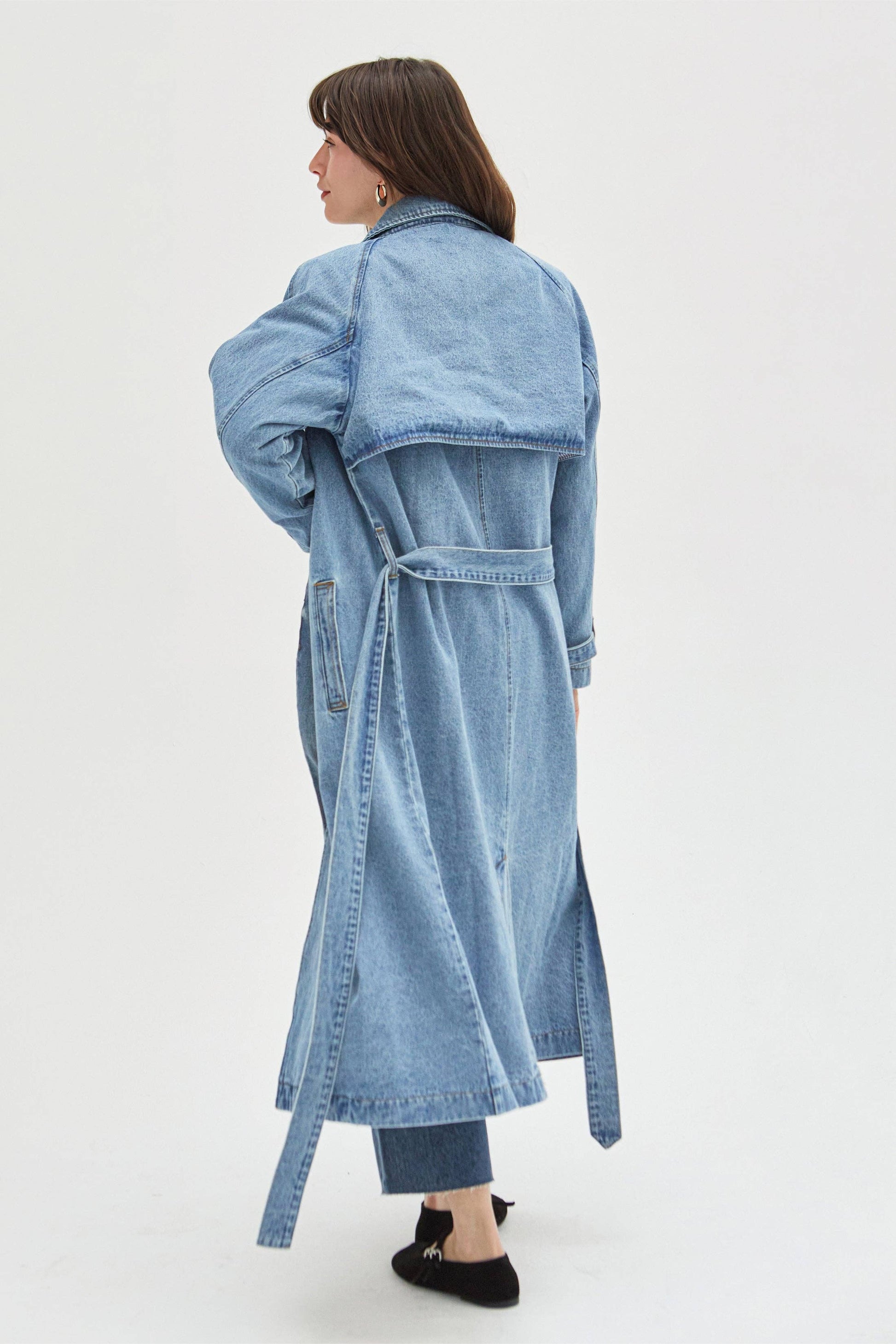 Original, oversized, and always-on. THE FIT: Oversized-fit double-breasted trench with deep side pockets and a matching denim waist belt. THE FEEL: Authentic, heavyweight denim made from 100% cotton.