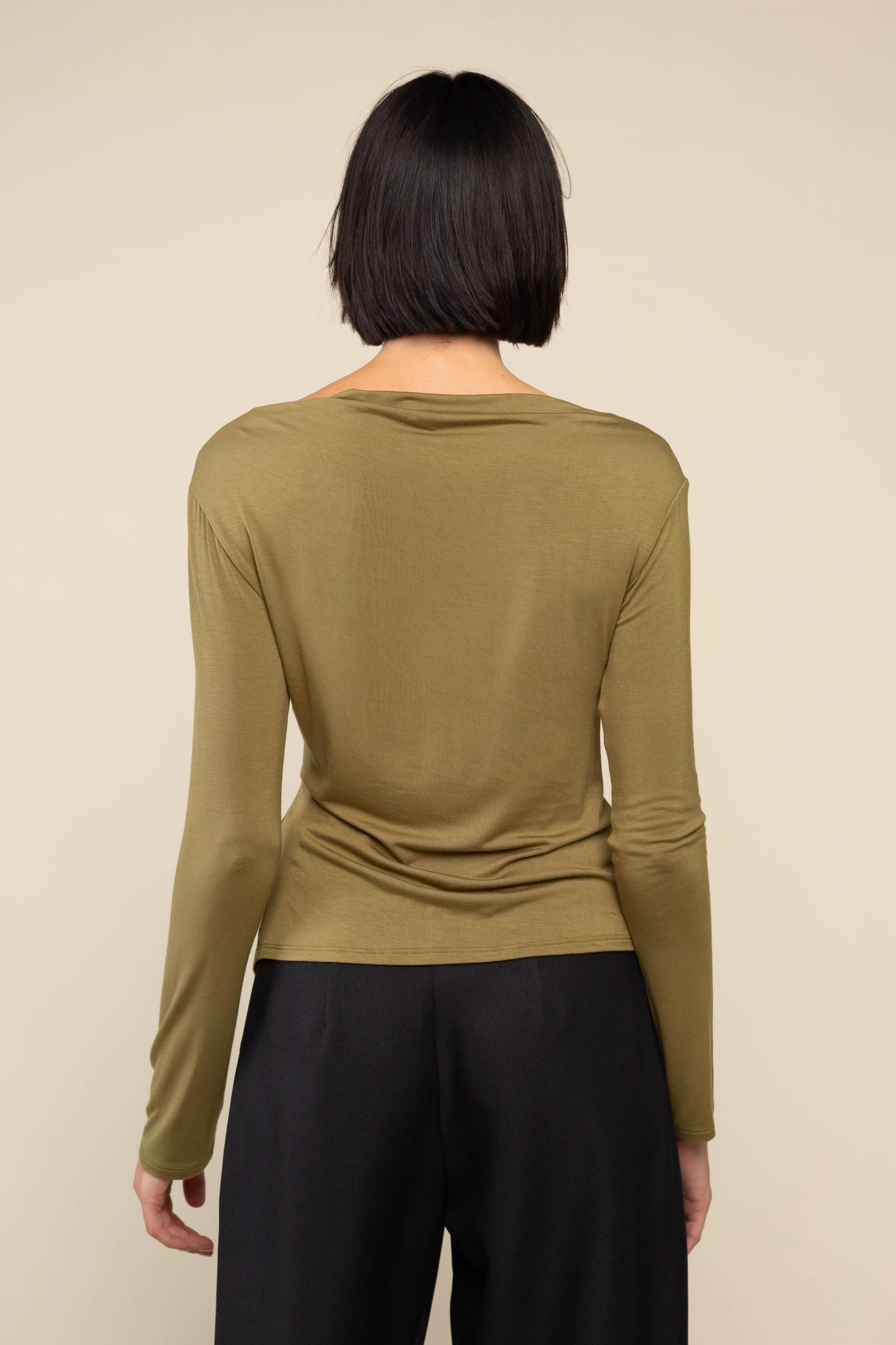 Boatneck long sleeve top with slit at front side hem. Made from our lightweight, soft, and stretchy bamboo siro fabric.
